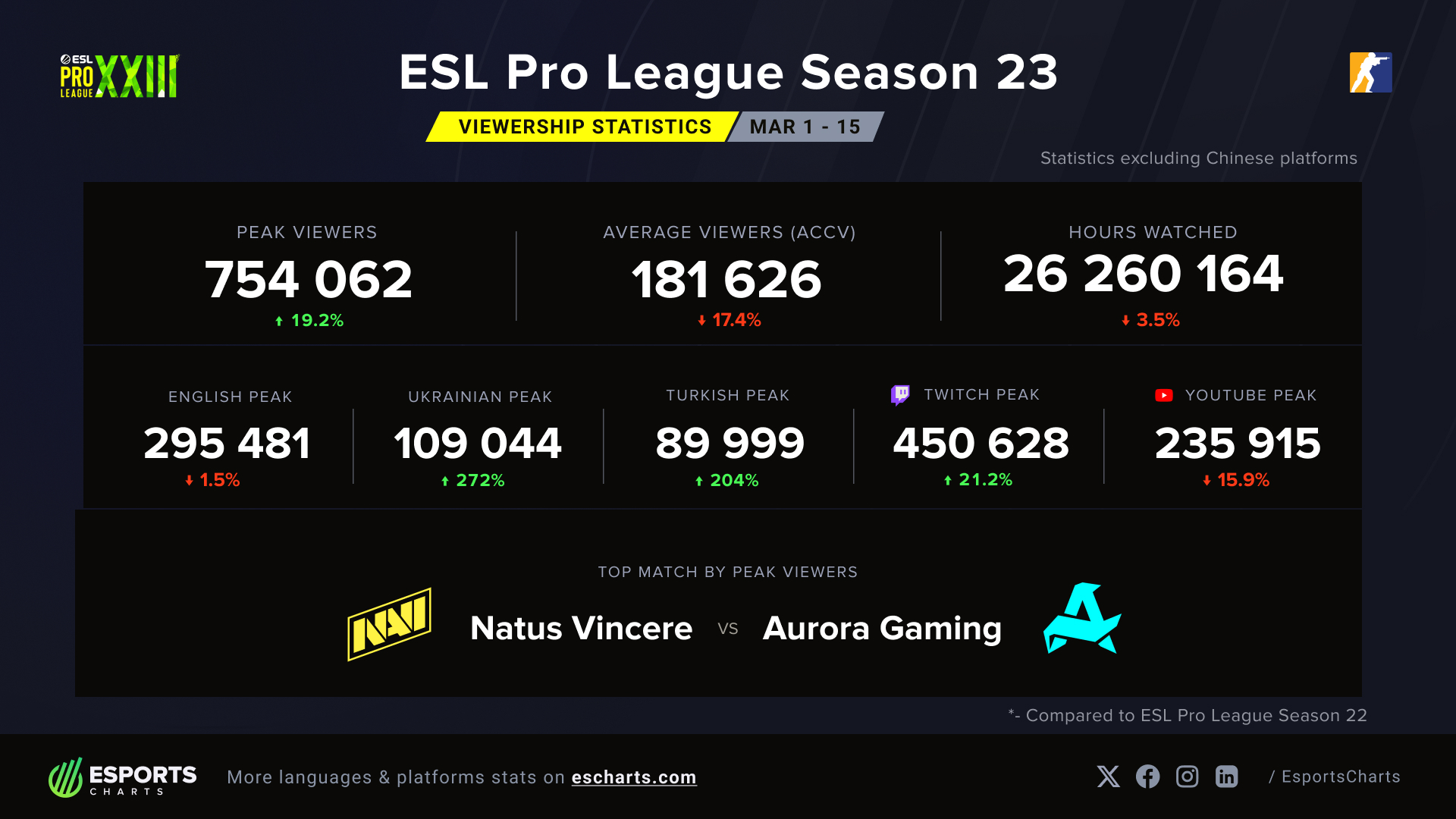 Duża w tym zasługa dwóch nacji – prawie 1/4 z tego wyniku zawdzięczamy streamerom z Ukrainy i Turcji, czyli krajom, których reprezentanci stanowili aż 70% zawodników w meczu finałowym, podczas którego zanotowano najwyższą oglądalność w peaku. Mimo wzrostu liczby widzów w szczytowym momencie, ich średnia na przestrzeni całego turnieju spadła aż o 17%. Reasumując wszystkie za i przeciw trzeba zaznaczyć jedno – 23. sezon EPL-a był najchętniej oglądanym turniejem tej rangi od ponad półtora roku. W przypadku 20. edycji rozgrywanej końcem roku 2024 przekroczono 800 000 widzów śledzących zmagania jednocześnie w najlepszym momencie transmisji.